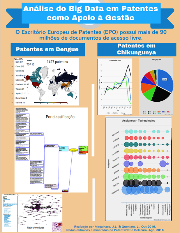Sem presunção de esgotar o assunto, mas no único sentido de exemplificar uma das ações de lidar com a avalanche de dados num mundo feroz tecnologicamente, de forma multidisciplinar e em tempos de luta pelo “open Science”, o projeto de software livre de fonte aberta, “crawler” Patent2Net (https://patent2netv2.vlab4u.info/ ), fornece serviços online e gratuitos para tratar mais de 90 milhões de documentos de patentes, cujo conteúdo de conhecimento tecnológico representa cerca de 90 países. Esse “rastreador” de patentes, permite identificar, extrair e tratar as informações tecnológicas do Big Data em Saúde. Portanto, usando o descritor “dengue”, obteve-se vários resultados, nos quais, alguns estão sintetizados no infográfico abaixo. Nele, foram recuperados 1427 documentos de patentes, através dos quais, com o cruzamento dos dados, foram possíveis extrair informações essenciais para os tomadores de decisão, tais como países depositantes, tecnologias existentes e suas respectivas interações, redes estabelecidas, tendências tecnológicas, inventores e suas localizações-redes etc. Da mesma forma, porém no sentido de exemplificar tratamentos de grandes dados na saúde, porém, com bases privadas, no mesmo infográfico, visualiza-se a evolução tecnológica para o descritor “chikungunya”.