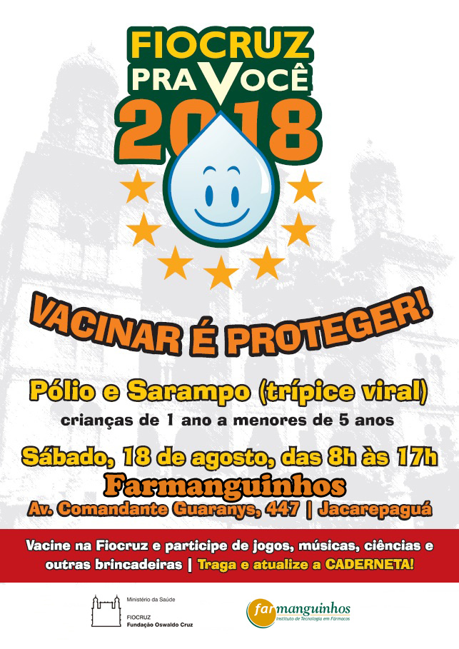 A Fiocruz realizará neste sábado (18/8), no Rio de Janeiro, o evento Fiocruz pra Você e Farmanguinhos receberá em Jacarepaguá a comunidade da Cidade de Deus e do entorno, para um dia de vacinação e muitas atividades. Serão oferecidas gratuitamente vacinas tríplice viral (sarampo, rubéola e caxumba) e a de poliomielite. O evento integra as ações do Dia D da Campanha Nacional de Vacinação do Ministério da Saúde, que ocorre de 6 a 31 de agosto.