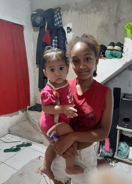 Juliana Peixoto Batista mora com as filhas Karolyn e Kauane, 10 e 7 anos, respectivamente, em barraco de madeira próximo à linha amarela, na Cidade de Deus. No momento, Juliana está desempregada, sem rede de apoio familiar. Ela já teve vínculo formal atuando na limpeza de uma creche. Hoje, a sua única renda tem sido o auxílio emergencial.