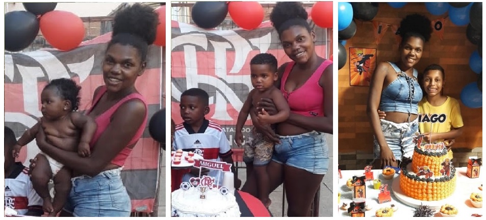 Rayana Torres Venâncio, de 27 anos, mora com o filho, a mãe e o irmão na Cidade de Deus. Antes da pandemia, trabalhava como auxiliar de Serviços Gerais. Desempregada, ela tem ido para as ruas da Barra da Tijuca para vender balas e assim complementar a renda familiar. Em razão dos acontecimentos, ela precisou parar a faculdade de Gestão de Recursos Humanos. Seu sonho é retomar os estudos e trabalhar nesta área.