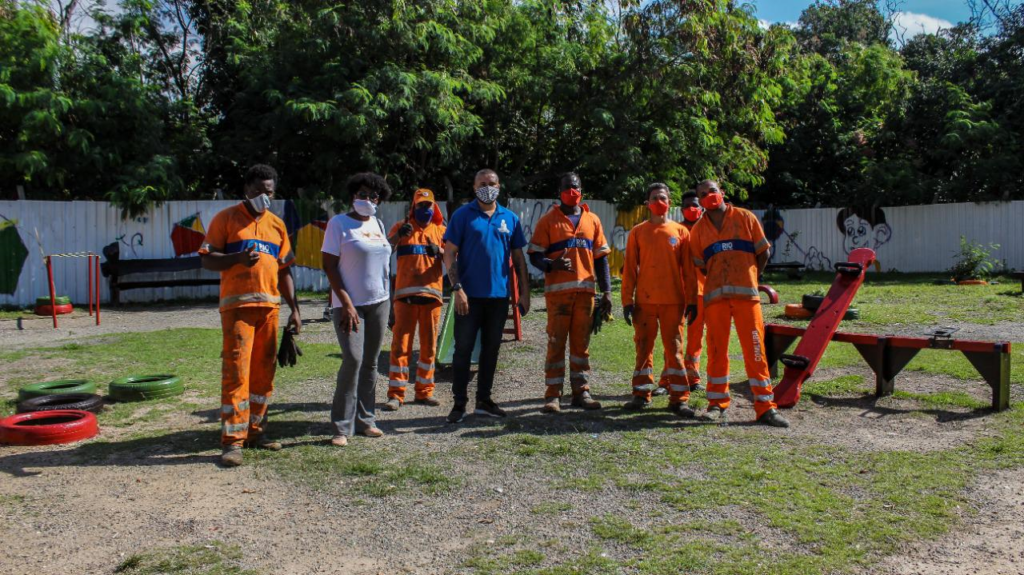 Magali Portela (de branco), com o gestor executivo Local CDD da Prefeitura, Diego Martins (de azul) e profissionais da Comlurb (Foto: Thiago Lima)