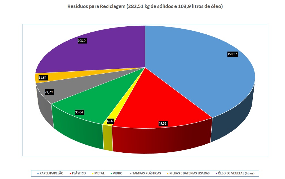 Dos materiais recolhidos pelo Centro de Segurança do Trabalho e Gestão Ambiental (CSTGA)/Seção de Resíduos, responsável pelo desenvolvimento e administração do programa, o papel foi o item mais coletado (159,37 quilos). Em seguida, óleo de cozinha usado (103,9 litros), plástico (49,51 quilos), vidro (33,04 quilos), tampa de plástico (24,29 quilos), pilha e bateria (11,64 quilos) e metal (4,66 quilos).