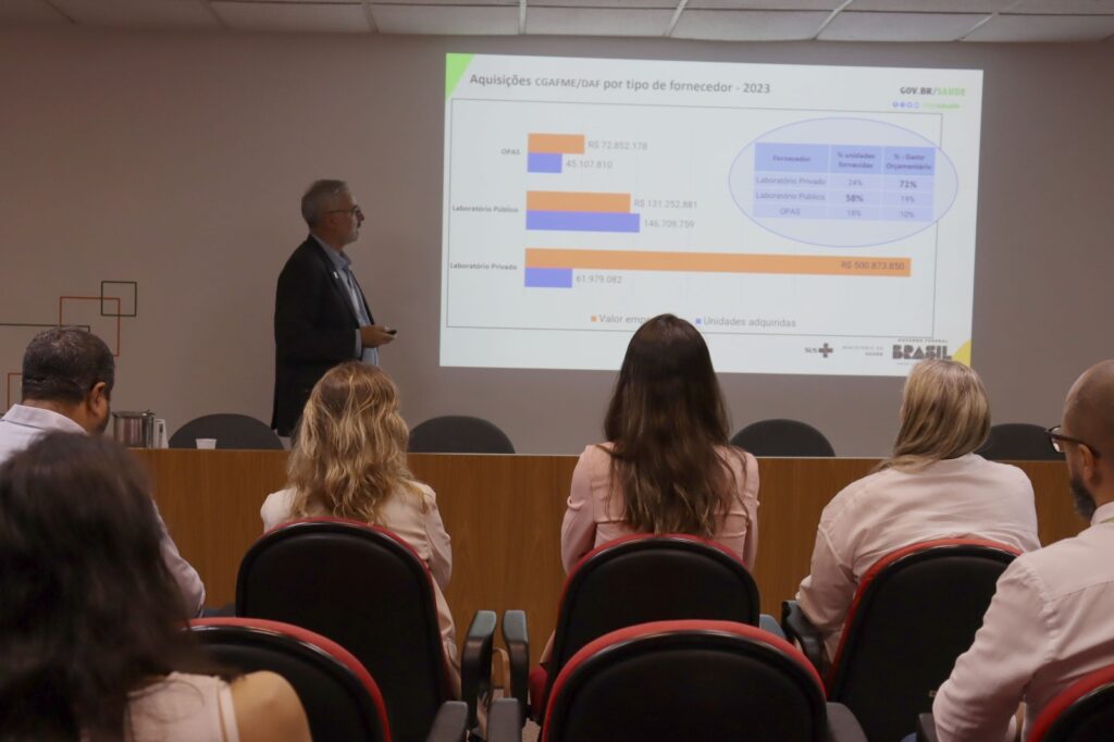 O Coordenador-geral de Assistência Farmacêutica e Medicamentos Estratégicos, Luiz Henrique Costa, apresentou o Componente Estratégico da Assistência Farmacêutica (Cesaf) e os medicamentos fornecidos por laboratórios públicos e privados. “Temos grande relação com doenças de vigilância em saúde, infecciosas, bacterianas, virais e negligenciadas. Atualmente, são 27 programas, com 77 fármacos em 112 apresentações distribuídas para o Sistema Único de Saúde (SUS). Nos dados gerais de 2023, há um equilíbrio grande no valor empenhado para medicamentos de laboratórios públicos e nas unidades adquiridas. Tem uma qualidade no laboratório público de conseguir fornecer 58% de tudo que necessita, com apenas 19% do gasto-orçamentário. Diferente do total pago aos laboratórios privados, envolvendo 71% do gasto e fornecendo 24% apenas”, falou.