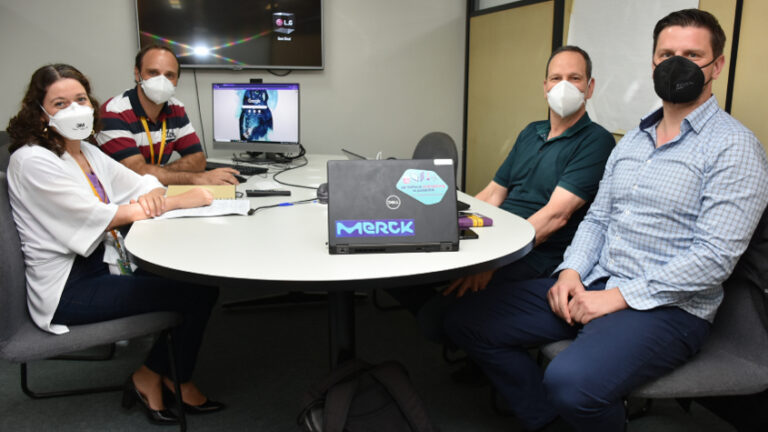 Os colaboradores de Farmanguinhos, Daniel Lacerda (camisa listrada) e Karen Gonçalves, recebem os representantes da alemã Merck KGaA, Adam Kabella e Dror Alexander Wohlfeiler. (Foto: Viviane Oliveira)