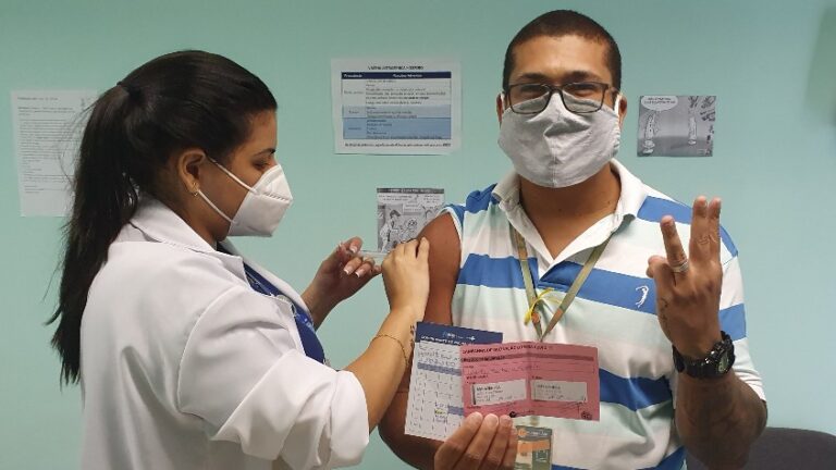 Colaboradores tomam a dose de reforço da vacina. Foto tirada antes da Portaria 26/22, da Presidência da Fiocruz.