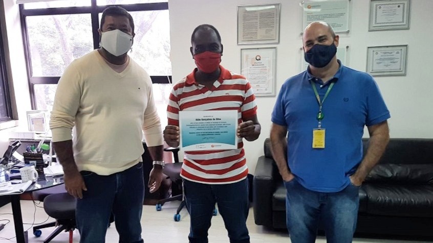 Ao lado do diretor, Jorge Mendonça (esquerda), e do vice-diretor de Gestão do Trabalho, André Cordeiro, Adão exibe o certificado que recebeu como homenagem da unidade