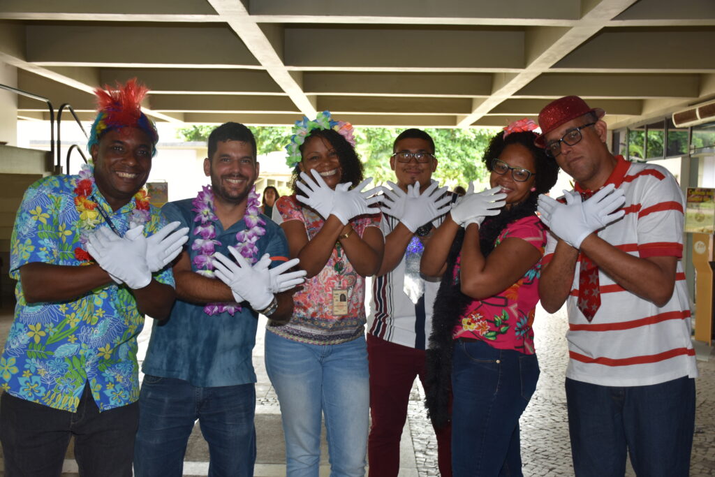 Adão com os colegas surdos e as intérpretes durante evento de carnaval