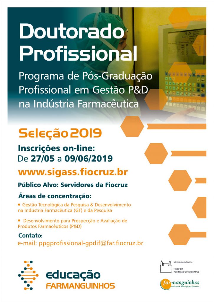 O Instituto de Tecnologia em Fármacos (Farmanguinhos/Fiocruz) abre inscrições para p processo seletivo do curso de Doutorado Profissional do programa de Pós-Graduação Profissional em Gestão, Pesquisa e Desenvolvimento na Indústria Farmacêutica (PPGP-GPDIF). Inscrições acontecem de 27/11 a 15/12/2025, na plataforma do Sistema Integrado de Ensino Fiocruz (SIEF-Fiocruz). Clique AQUI e confira o edital.