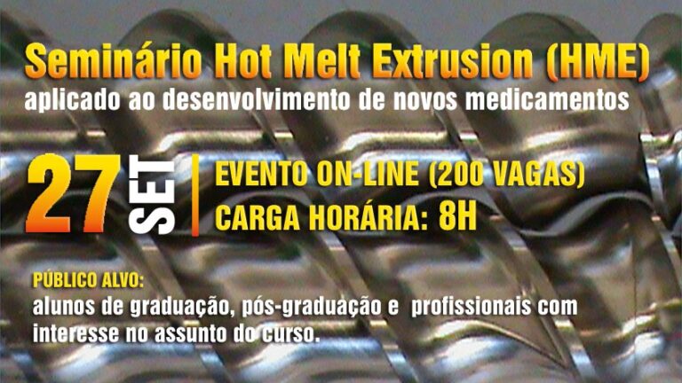 Farmanguinhos promove o seminário “HME aplicado ao desenvolvimento de novos medicamentos” com o objetivo de levantar um debate amplo sobre o desenvolvimento da Hot Melt Extrusion, uma tecnologia muito disruptiva e relativamente nova no país. O curso abordará aspectos regulatórios, preparo e caracterização de novos produtos e experiências no exterior. São oferecidas 200 vagas para alunos de graduação, pós-graduação e profissionais com interesse no tema. As inscrições são gratuitas e poderão ser efetuadas até 26 de setembro. O seminário on-line será realizado no dia 27/09, das 9h às 18h.