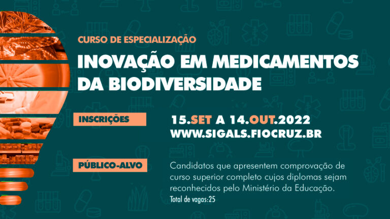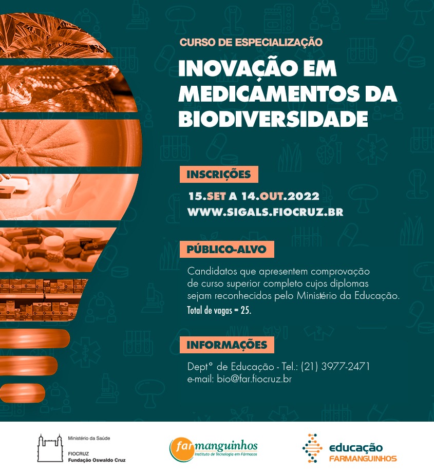 O Instituto de Tecnologia em Fármacos (Farmanguinhos/Fiocruz) abre inscrições para o Curso de Especialização em Inovação em Medicamentos da Biodiversidade. Ao todo, serão disponibilizadas 25 vagas para a pós-graduação Lato Sensu. Clique aqui e confira o edital. O curso é gratuito. Interessados podem se inscrever de 15/09 a 14/10 na plataforma SIGA (http://www.sigals.fiocruz.br/).